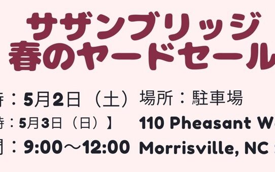 Read Moreこの度、サザンブリッジでは春のヤードセールを開催することとなりました。 ご自宅でご不要な物がある方、断捨離中の方、お引越しを予定されている方は、ぜひご参加ください。 日 時:5月2日(土) ※雨天時:5月3日(日) 時 間: 9:00~12:00 場 所: 110 Pheasant Wood Ct., Morrisville, NC 27560(駐車場) お問い合わせ:sbi@southernbridgeintl.org
