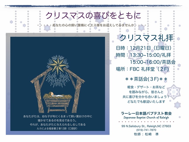 また、日本語のクリスマスメッセージをとおして、クリスマスの恵みを共に分かち合いましょう!どなたでもお気軽にお越しください!心から歓迎いたします。礼拝後は、コーヒーやお茶を飲みながら、ゆっくりしていってください。皆さまのお越しをお待ちしております。