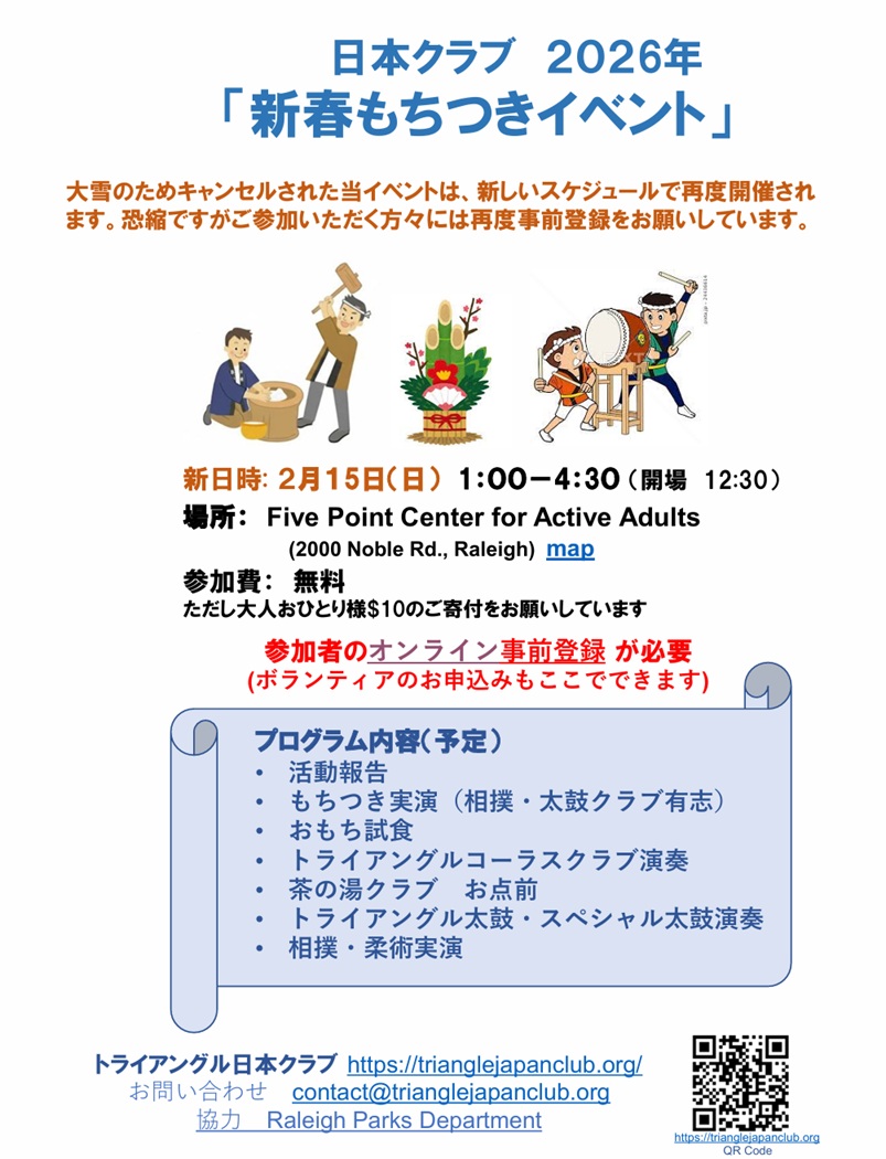 1/25に予定されていた餅つき大会は悪天候のために見送られ、2月15日(日) に改めて開催が決定しました。
